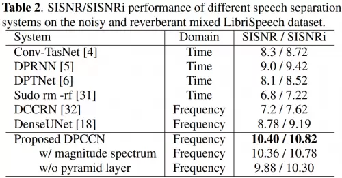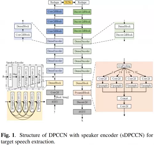 在本次论文中,联合实验室团队从时频域的角度出发,提出了一种基于U-Net结构的语音分离模型DPCCN(Densely-connectedPyramidComplexConvolutionalNetwork),并在DPCCN基础上,设计了一个特殊的目标说话人声纹编码模块来对目标说话人的注册语音进行声纹信息提取,从而监督DPCCN分离网络提取出相应的目标说话人语音sDPCCN。在业界公开带噪带混响的LibriSpeech数据集合上,实验结果显示所提出的DPCCN方法显著超过了目前业界主流技术。
