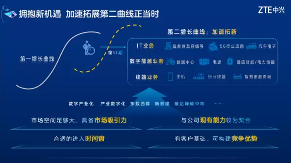 为什么选择IT、数字能源和终端等作为中兴通讯第二曲线的发力方向,谢峻石指出,一是这些方向所覆盖的领域市场空间足够大,具有足够的市场吸引力;二是随着国家新基建、数字化产业、产业数字化的加速,东数西算等国家重大战略工程的落地以及国家双碳计划背景下的全产业转型,我们正处于最合适的市场窗口期;三是当前市场的需求和公司现有的能力非常契合,在这些领域,公司在产品、技术、市场已经有了多年的沉淀和储备;四是我们有非常良好的客户基础,公司的产品和解决方案已经在这些行业和领域有了规模应用,能够构建起我们的核心竞争优势。
