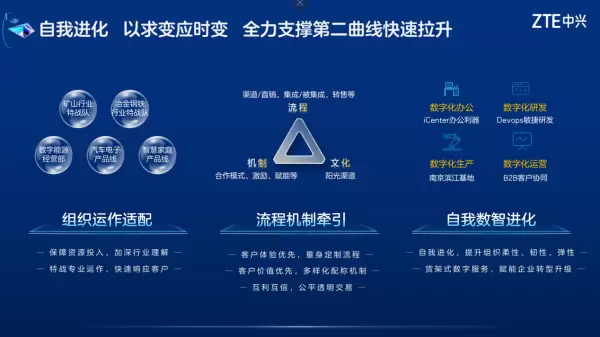 为此,中兴通讯将聚焦长板,以不变应万变,为第二曲线发展构筑坚实的数字底座;同时将坚持开放合作,互利共赢的理念,和教练式合作伙伴一道深入产业,发挥双方优势,从万变中找不变,共同探索第二曲线发展的最佳路径;此外,为全力支撑第二曲线业务的快速拉升,中兴通讯主动变革,加速自我进化,以求变应时变,快速响应客户需求,与合作伙伴携手实现共生、共智、共赢。