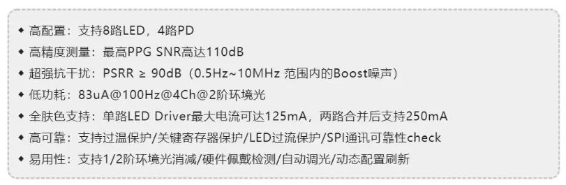 经实测数据显示,CS1262 芯片的关键性能指标达到业界一流水平,可以与主流 AFE 设计兼容,能够为用户提供高配置、高精度测量、超强抗干扰、低功耗、全肤色支持、高可靠及易用性等七大核心价值。