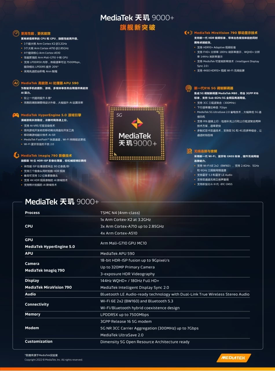 根据联发科官方资料,天玑9000+较上一代 CPU 性能提升 5%,GPU 性能提升10%。其采用了先进的台积电4nm制程,CPU依旧是当今最新的Armv9架构,八核CPU包括1个主频高达3.2GHz的Arm Cortex-X2超大核、3个主频为2.85GHz的Arm Cortex-A710大核和4个Arm Cortex-A510能效核心,GPU方面则采用Arm Mali-G710旗舰十核GPU。同时,天玑9000+支持传输速率可达 7500Mbps 的LPDDR5X内存,以及8MB CPU三级缓存和6MB 系统缓存。