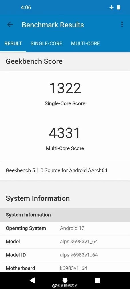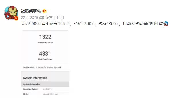 天玑9000+ GeekBench 5 CPU单核跑分1322,多核4331