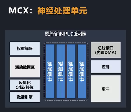 MCX N系列中的NPU由恩智浦自主进行设计,拥有出色的性能和能效,采用单一架构,性能可覆盖从高效的32次运算/周期至超过2000次运算/周期,并支持未来的扩展。相对于以往采用CPU进行机器学习,性能有了巨大提升,例如对比Cortex-M33内核有至少30倍以上或更高的加速。由于机器学习的卷积处理改为由NPU全权负责,也就不必占用CPU资源。
