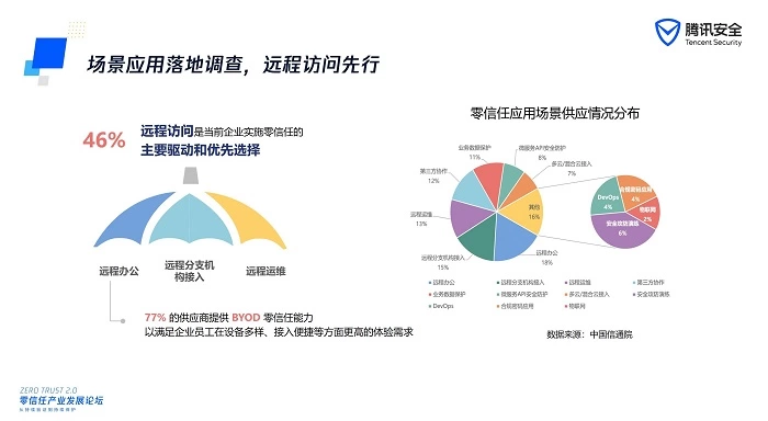 论坛上,中国信通院云计算与大数据研究所所长何宝宏公布的信通院调查数据显示,当前有46%的企业选择零信任是源于“远程访问”的需求,“远程访问”是当前企业实施零信任的主要驱动和优先选择。与此同时,有77%的供应商提供BYOD (自带设备)零信任能力,以满足企业员工在设备多样、接入便捷等方面更高的体验需求。