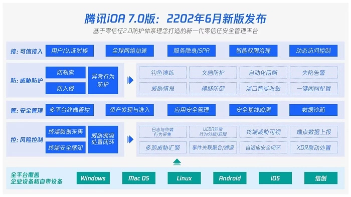 在此背景下,腾讯安全重磅发布了全新升级的零信任安全管理系统——腾讯零信任iOA7.0版本。据了解,腾讯零信任iOA7.0在可信接入、威胁防护、安全管理、风险控制及全平台覆盖等维度上实现了焕新升级,提升了接入安全性和效率,打造了立体防御体系,实现多平台终端全管控和XDR全程联动响应;此外在平台覆盖上也提升了产品自适配度,有效支持企业设备和自带设备。