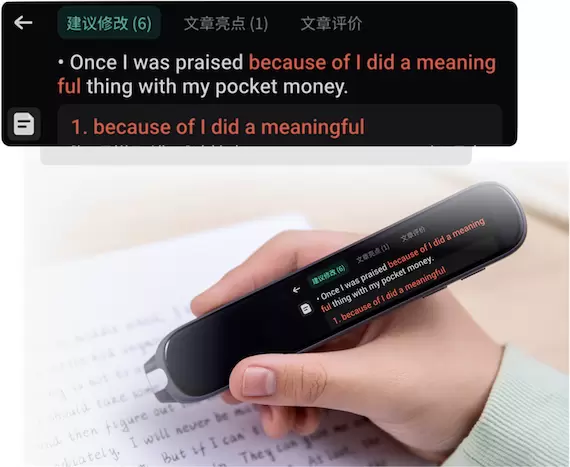 讯飞AI翻译笔P20 Plus的作文批改功能,能更好地检视孩子的英语写作情况,智能纠正拼写错误和语法错误,查漏补缺,对症施策,实现个性化重点提升。