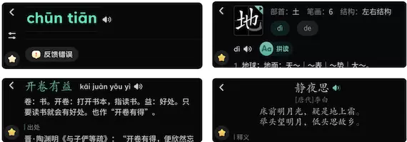 讯飞AI翻译笔P20 、P20 Plus均支持中文字、词、句、古诗文学习。汉字拼音、释义、笔顺笔画动态展示,规范书写;成语释义、出处、典故等全方位学习。古诗文标题或句子轻轻一扫即可查询全诗,逐句对照字词注释和大意,更有古诗词原文、白话文赏析、作者简介等内容的真人讲解音频,声情并茂,学习更生动。