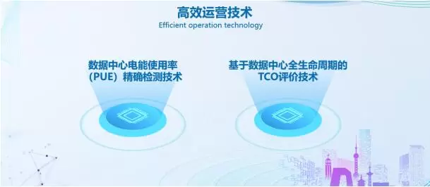 高效运营技术,包含“数据中心电能使用率(PUE)精确检测技术”、“基于数据中心全生命周期的TCO评价技术”,“精确检测技术”通过建立完备、持续的PUE度量系统,实现各系统用电量精确计量,定位现场问题,解决实际能效与设计能效差距大的难题。“TCO评价体系”从跨越整个生命周期的角度衡量和管理IT投资所产生的价值及其全部成本,便于后期不同阶段、不同类别费用的控制。