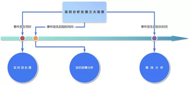站在技术角度可以将实时需求分为三类:实时流处理、实时按需分析、离线分析。通过下图,以一个事件发生的前后作为时间轴,可以将时间线分为三个阶段,分别是事件发生的同时、事件发生后短时间内、事件发生后较长时间,对应的实时要求分别是实时流处理、实时按需分析、离线分析。