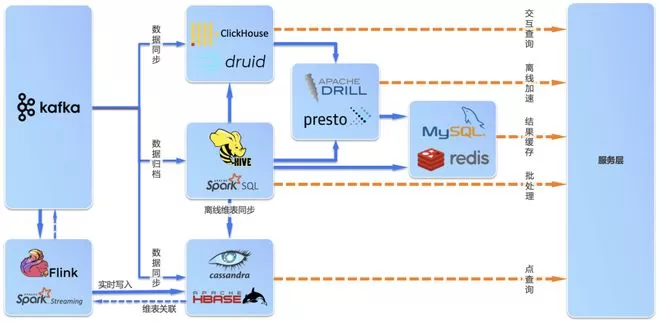 Lambda 在实际生产环境中的部署通常要比上图更加复杂,下图是贴近实际部署的典型示例。可以看出,实际情况要通过一系列不同的存储和计算引擎 (HBase、Druid、Hive、Presto、Redis 等) 复杂协同才能满足业务的实时需求,此外多个存储之间需要通过数据同步任务保持大致的同步。Lambda 架构在实际落地过程中极其复杂,使整个业务的开发耗费了大量的时间。