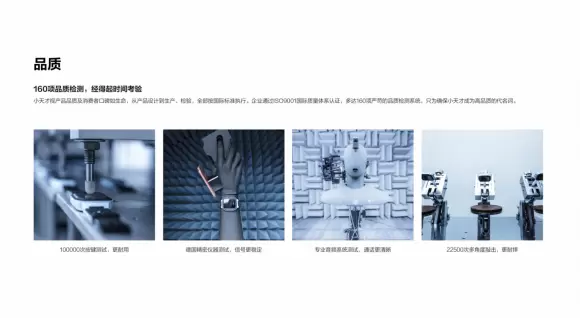此外,小天才还有着20余年的电子产品生产、制造经验,拥有一整套独立、先进的生产测试和产品制造过程控制系统,从产品设计到生产、检验等均按照国际标准执行。例如10万次按键测试、2.25万次多角度敲击测试、专业音频系统测试等,以检验其产品的耐用性、耐摔性和通话的清晰度等。