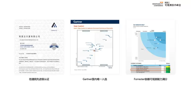 阿里云可观测凭借其完备产品能力与良好的生态集成能力,以及出色的成本优势,收获了国内外行业机构的高度认可。阿里云应用实时监控服务ARMS在今年获得中国信通院首批可观测产品先进级认证。同时,阿里云连续两年进入Gartner APM与可观测魔力象限,今年更是成为唯一入选的中国厂商。