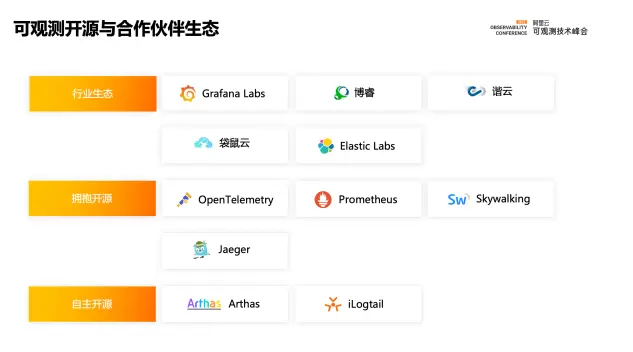 为了提供更丰富、优质、低门槛的可观测服务与能力,阿里云大力发展生态伙伴。自2017年与Elastic公司合作,合力打造标准、可靠、低成本全观测场景存储及分析产品Elasticsearch。过去一年,阿里云与Grafana Labs、博睿数据、谐云、袋鼠云等企业达成战略合作,与阿里云自研可观测体系无缝集成,把引领业界标准的优秀产品与技术服务带给阿里云的海量客户。