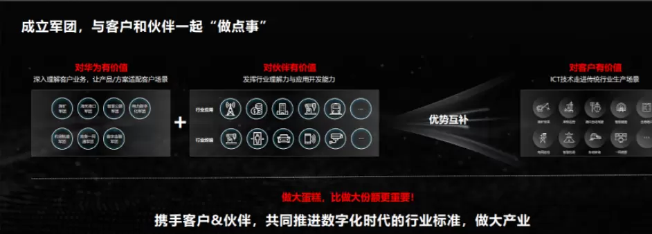对此,华为中国政企业务总裁吴辉也谈道,华为军团所积累的行业数字化经验同样可以传递到商业市场。举例来说,华为军团在一些行业进行“0~1”阶段的场景数字化创新,再在“1-3”阶段进行更多的能力、经验、方案的沉淀,最终以能力的形式传递给伙伴,并在“3-N”的阶段,由伙伴作为主力军,服务好广大的商业市场客户。