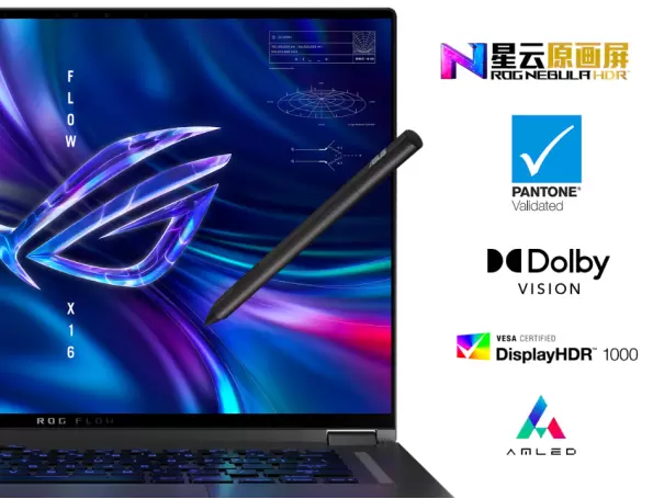 ROG幻16翻转版最为“吸睛”之处,莫过于顶配版搭载的ROG星云原画屏。该屏幕采用领先业界的MiniLED显示技术,拥有512分区背光,得益于密集的灯珠布局,其峰值亮度可达1100尼特。同时,该屏幕拥有2.5K分辨率及165Hz刷新率,屏幕比例为16:10,覆盖100% DCI-P3专业广色域,且获得Pantone色彩认证。高达5400Hz的高频PWM调光,可降低25%的光晕显示问题。凭借内置的AI芯片及智能算法,无论是深度创作还是观看高画质影片,这块屏幕均可实现全方面适配的显示效果。