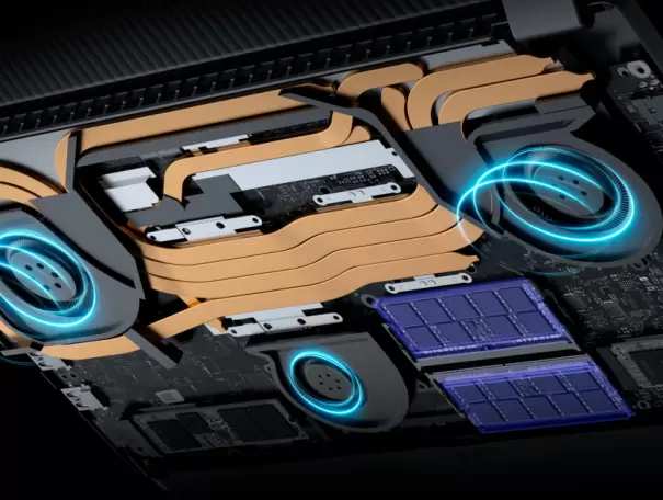 针对满值的性能输出,ROG幻16翻转版在散热规格上也一步到位。其CPU区域覆盖ROG与德国暴力熊联合定制的液金散热介质,相比普通硅脂可进一步降温10℃。覆盖其上的330片0.1mm冰翼鳍片及5根热管可迅速吸收热量。在三风扇、四出风口的支持下,高效的散热链路可为内部疾速降温,远离过热降频。