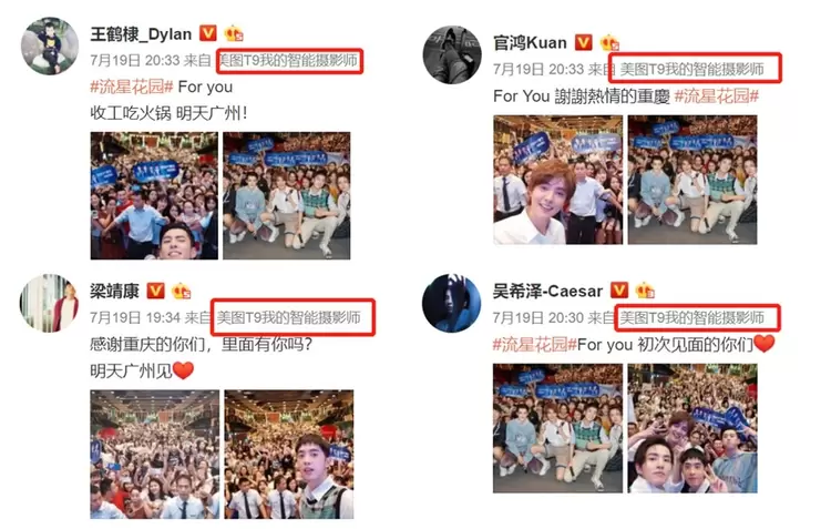 看来流星花园新F4已经被美图T9妥妥圈粉了!此次重庆、广州之行,四位小哥哥更是在微博大晒美图T9拍下的合影照片,粉丝开心表示“更微博的频率都高了!”一连串的“for you”搭配现场自拍照,让屏幕前的粉丝也能感受到活动现场的热情氛围。
