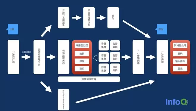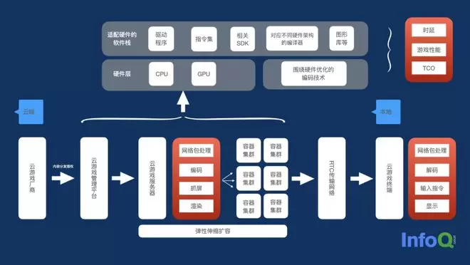 在这一架构内,至云游戏终端前,所有服务都在云端、公共网络上完成,保证用户无需下载游戏或是为了玩游戏购置高性能终端。游戏玩家的终端,主要负责对网络包进行处理、对渲染后的游戏画面进行解码、显示,并相应地输入指令,回传给服务器。