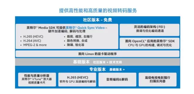 当然,只有 GPU 硬件本身是不够的,英特尔® Media SDK 几乎是搭配 GPU 的必选项。英特尔® Media SDK 提供的是高性能软件开发工具、库和基础设施,以便基于英特尔® 架构的硬件基础设施上创建、开发、调试、测试和部署企业级媒体解决方案。