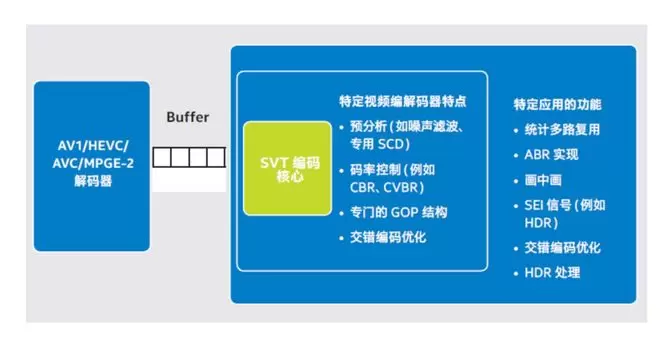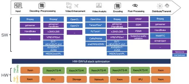另一个值得关注的核心是编码器,它横跨了蓝色区域和紫色区域,既有行业通用的 ffmpeg,也有英特尔自研的 SVT,二者同样引人关注。