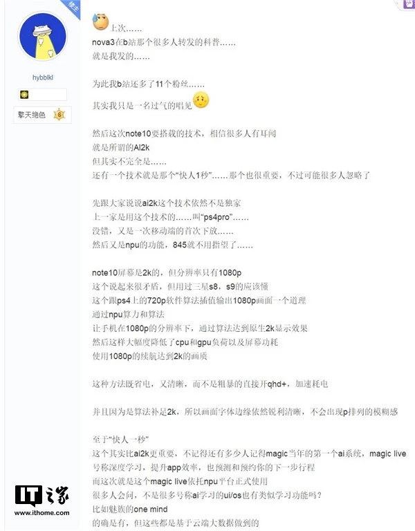 另外该网友还表示除了AI 2K技术之外,荣耀Note 10还将搭载Magic Live系统,通过NPU的深度学习来提升App效率。和其他的系统相比,Magic Live系统更准确,更深度,更效率,同时也更加注重隐私。