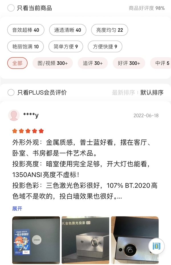 而在京东平台上,Vidda C1的用户好评率高达98%,许多用户在购买使用后表示,色彩非常棒,高色域效果非常好,亮度真实不虚标,即便是投在普通的白墙上,效果也十分不错。