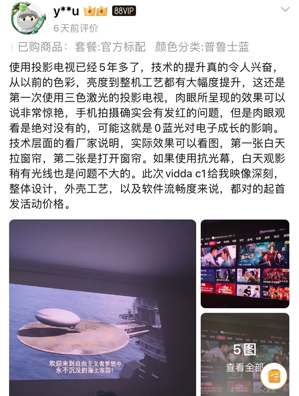 而在天猫平台,许多用户对Vidda C1也是赞不绝口,一位使用智能投影产品长达五年的用户表示,技术的提升真的令人兴奋,无论是画面亮度还是肉眼所呈现的效果都非常好,并且0蓝光的护眼效果也不错。