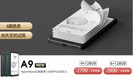 畅读宠粉日活动期间,购买海信阅读手机A9,4GB+128GB版本1799元,6GB+128GB版本1999元,此外购机可享6期免息,30天无忧试用,晒单好礼返现,可谓超值。