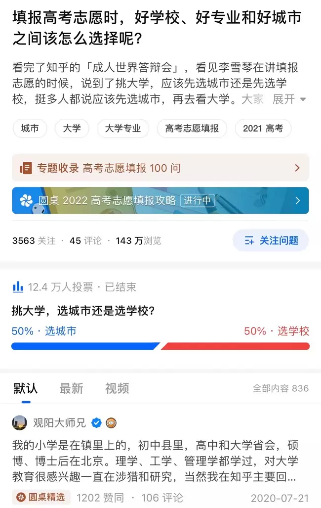 知乎高考主题活动自5月底上线以来,通过真实的高考“过来人”、权威的专家名师和高考大数据系统等,在海量的高考志愿填报信息面前,为考生和家长解决志愿填报信息差,帮助他们找到匹配自身需求的填报答案,提升填报决策效率。