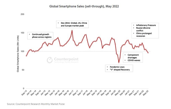 据Counterpoint Research最新报告显示,2022年5月全球手机市场销量环比下降4%,同比下降10%,至9600万部。这是10年来第二次跌破1亿部。