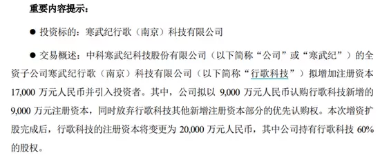 寒武纪于2021年6月23日公告,公司全资子公司行歌科技拟增加注册资本 1.7亿万元并引入投资者。其中,公司拟以9000万元认购新增注册资本9000万元,本次交易的共同投资方包括天津歌行、天津行歌、天津行且歌、天津歌且行及其他非关联投资方。