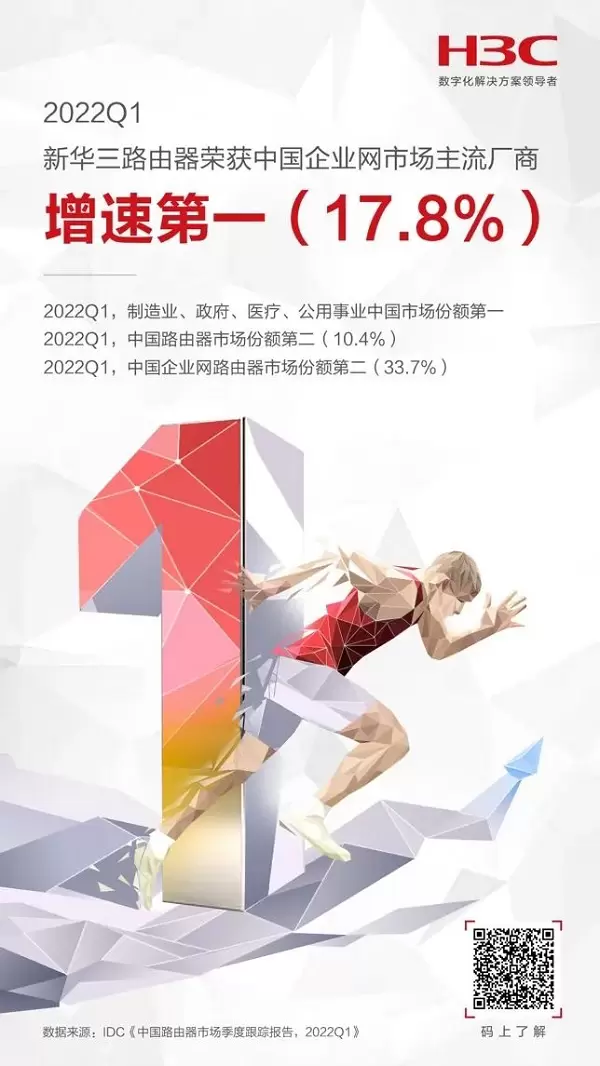 近日,国际数据公司IDC发布《中国路由器市场季度跟踪报告,2022Q1》,报告显示,2022年一季度,紫光股份旗下新华三集团以17.8%的市场增速,位列中国企业网路由器市场主流厂商增速第一,并且在制造业、政府、医疗、公用事业等关键行业的市场份额排名中拔得头筹。在整体市场份额上,新华三更是以10.4%的份额位居中国市场第二,并连续五年稳居市场前二。广泛的市场认可来自新华三长久以来的持续技术创新与坚定投入。同时立足广域网技术领域,更是不懈推动“AD-WAN+”解决方案的行业部署与应用,以期为各行业用户数字化转型打造智能联接底座。