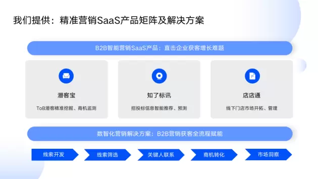 作为B2B营销自动化在获客领域的代表服务商,百炼智能认为,新环境下的B2B营销应牢牢抓住“主动精准获客”这一标尺。经济形态在变化,互联网式扫街获客将为企业带来可持续化的增长价值。当前,百炼智能正在为企业提供数据驱动、深耕场景的B2B智能化营销SaaS产品及数字化解决方案,已经构建起丰富成熟的企业数据库及行业知识库矩阵,旗下产品包括知了标讯、潜客宝、店店通等,致力于通过AI技术帮助企业提升从市场洞察到销售线索开发、筛选、联系、转化的营销全流程效率。