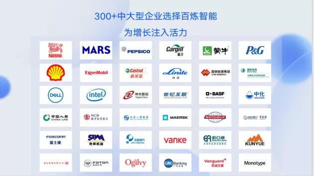 精准营销获客在不同行业的复制仍在继续,据了解,目前有超过300家企业正在选择百炼智能实现B2B营销数智化转型,为增长注入活力,他们广泛分布于科技、快消、制造、能源化工、金融等领域,包括壳牌、美孚、雀巢、宝洁、玛氏、百事食品、国家能源、巴斯夫、中国人寿、Dell、Intel等世界500强企业及大型知名企业。