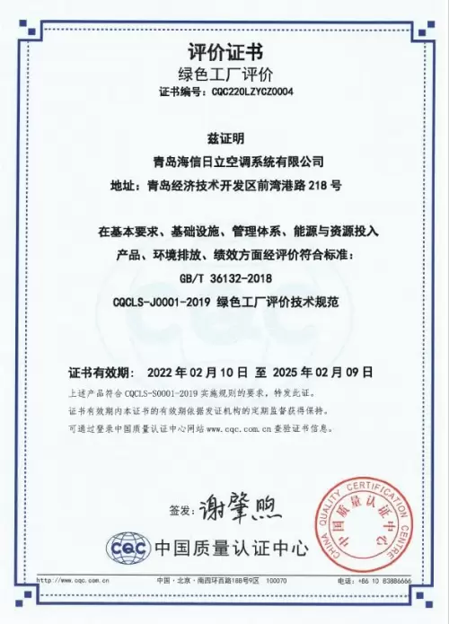 努力总有回报,在节能产品、方案与领先科技等领域的积极投入下,海信中央空调已经得到了认可,上半年成功斩获由中国质量认证中心颁发的“绿色工厂评价证书”。相信海信中央空调未来也将继续深耕低碳事业,发挥民族品牌的魄力与担当,以打造绿色社会为己任,将更优质的产品、更高端的绿色方案呈现给市场、消费者。
