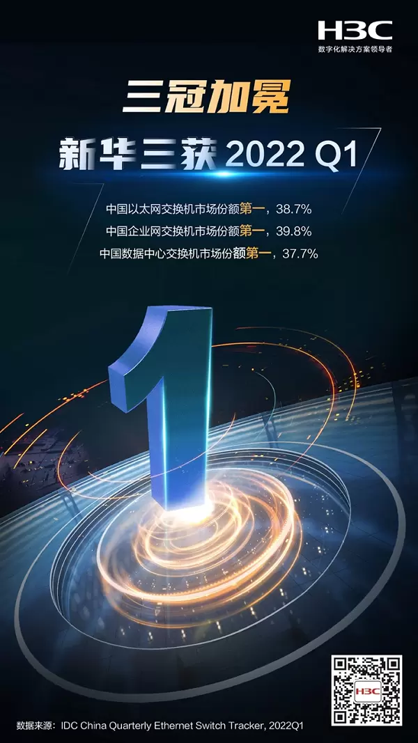近日,国际数据公司IDC发布《中国以太网交换机市场季度跟踪报告(2022Q1)》,报告显示,紫光股份旗下新华三集团在中国以太网交换机、企业网交换机、数据中心交换机市场,分别以38.7%、39.8%、37.7%的市场份额独揽三项第一,实力诠释了中国网络市场领导者地位。