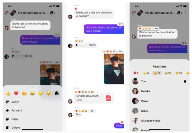 消息表情回复:用户可以在单聊和群聊中对消息添加、删除表情。表情可以直观地表达情绪,使用表情回复增加用户互动,提升用户使用体验。同时在群组中,利用表情回复可以发起投票,根据不同表情的追加数量来确认投票。