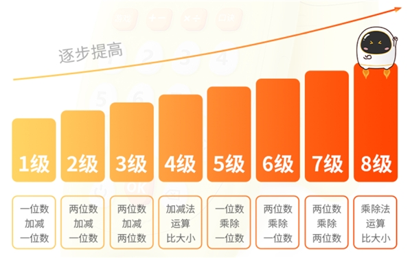 孩子的数字敏感期有早有晚,对数字的敏感度有强有弱,结合不同年龄段,不同基础孩子的需求,阿尔法蛋口算宝设置了8个难度等级的口算题库,难度由基础的一位数加减逐渐提高到两位数乘除比大小。