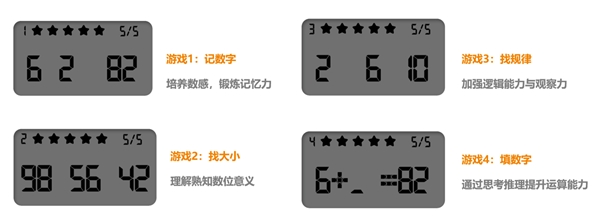 只练不玩儿,时间久了孩子难免觉得枯燥,阿尔法蛋口算宝设置了记数字、找大小、找规律,填数字等四款数字游戏,帮孩子持续提高对数字的兴趣和敏感度。