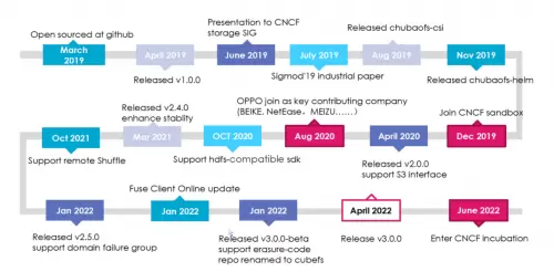CubeFS 是国内首个云原生开源分布式存储产品,2019 年开源并捐赠托管至云原生计算基金会(CNCF),2020 年 10 月 OPPO 开始主导 CubeFS 社区运营与版本迭代,累计发布 7 个 release 版本。在 OPPO 的全力推进下,CubeFS 于 2022 年 6 月进入 CNCF 孵化阶段。