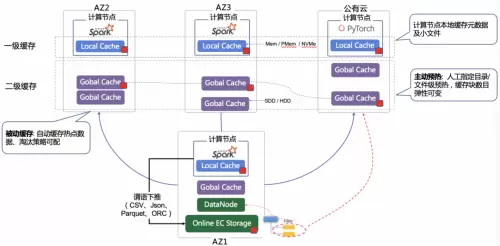 CubeFS 在数据湖访问加速问题上提出了跨区域跨云的“多级缓存能力”和“谓词下推操作”两个解决方案。目前多级加速功能已上线,一级本地缓存与计算节点同机部署,支持元数据和数据缓存,支持内存、PMem、NVme、HDD 不同类型介质,访问时延低但容量少;二级全部分布式缓存副本数目弹性可变,提供机房位置感知能力,支持用户/桶/对象级的主动预热和被动缓存,数据淘汰策略也可配置。谓语下推操作策略显著减少了存储与计算节点间大量的数据流动,降低了资源开销并提升计算性能。
