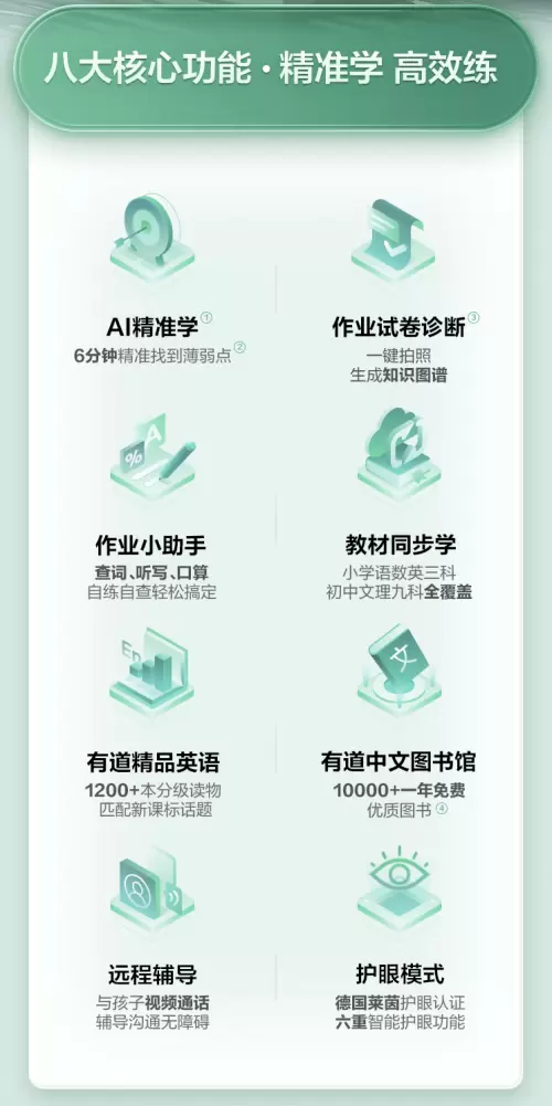 网易有道推出的这款AI学习机,主打八大功能,即AI精准学、作业试卷判断、作业小助手、教材同步学、有道精品英语、有道中文图书馆、远程辅导、护眼模式。值得一提的是,网易有道AI学习机涵盖小学语数英三科,初中文理九科教材课程,教材版本地域覆盖率90%,有效地解决了暑期辅导难题。