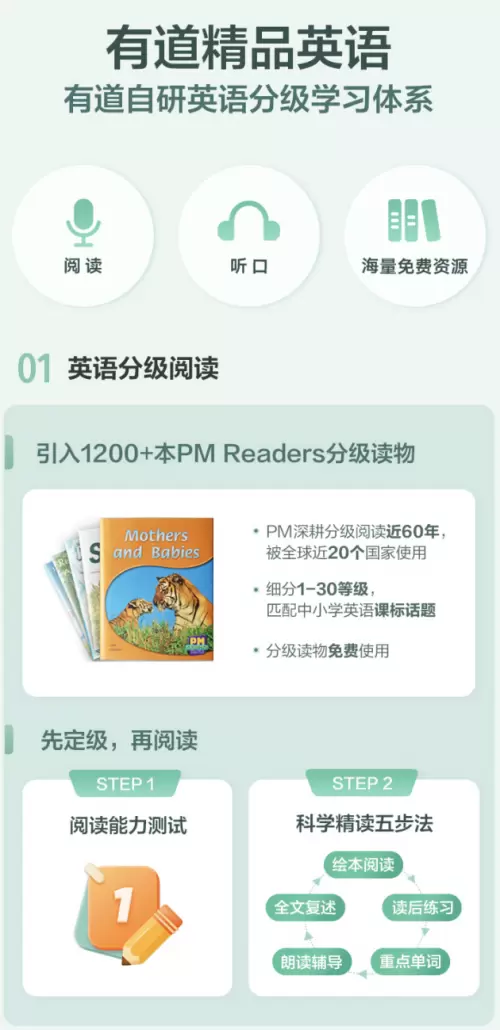 与其他学习平板不同的是,网易有道AI学习机还拥有专属的有道精品英语功能,它搭载了有道精品英语和自研英语分级学习体系。它创造性地引入了1200本PM Readers分级读物,内含 1-30个等级,匹配中小学英语课标话题,并且这个部分学生可以免费使用。为了匹配个人能力,它还会提供阅读能力测试,并在其后的阅读过程中提供如绘本阅读、课后练习、重点单词、朗读辅导、全文复述的练习环境。为了提升口语部分,该学习机还会提供角色扮演和AI情结对话等功能。