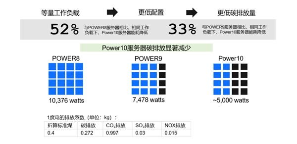 另外,随着主机核心算力的提升,相同工作负载下所需要的配置更低,碳排放量更低,如下所示: