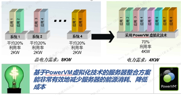 同时,采用PowerVM硬件虚拟化以后,可以进一步帮助节省能耗。如下图中的某案例所示,通过PowerVM的虚拟化整合后,服务器的利用率提高到70%,能耗从以前的8KW下降到4KW。