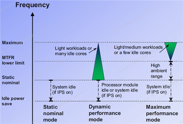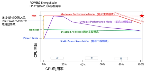 浪潮K1 Power服务器采用的EnergyScale技术,实现了服务器多电源管理模式,包括新的可变处理器频率模式,能够在静态标称频率之外提供显著的性能提升,具体节能模式如下: