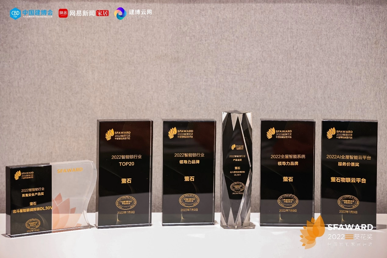 得益于专家评审团的专业、客观,葵花奖被业界称为含金量最高的奖项。萤石网络经过专家评审团、网络票选等一致评定,最终从众多品牌中脱颖而出,萤石北斗星智能视频锁DL30V 获“2022智能锁行业产品金奖”、“2022智能锁行业质量安全产品”;萤石斩获“2022智能锁行业领导力品牌”、“2022智能锁行业TOP20”、“2022全屋智能系统领导力品牌”;萤石物联云平台获“2022 AI全屋智能云平台服务价值奖”,共计六项重量级荣誉。