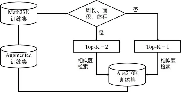 该方法针对Math23K训练集中的每一道题,首先判断是否属于图形周长、面积和体积类题目。若属于,则top-K取值为2,同时通过相似题检索从Ape210K中召回对应的相似题;若不属于,则top-K取值为1,同样进行相似题检索。最后,将找到的相似题添加至Math23K训练集中,数据增强后的训练集约包含42000道题。