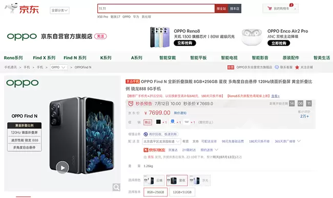 位列第二位的是OPPO首款折叠屏手机Find N。OPPO Find N搭载骁龙888处理器,整机使用了3D微曲面的机身设计,外屏使用的是一块5.49英寸的OLED中置挖孔屏。影像方面,采用5000万像素IMX766主摄,1600万像素IMX418超广角镜头以及1300万长焦镜头组成了OPPO Find N的三摄阵容,而内外屏前置摄像头的像素同为3200万。值得一提的是,OPPO Find N采用的水滴铰链对屏幕折痕进行了优化,另外还有自研精工拟椎式铰链技术加持,屏幕弯折时可以形成自然的水滴形状,有效减轻视觉折痕,8+256GB版京东到手价7699元,下单还可享以旧换新至高补贴640元、180天只换不修等服务保障。