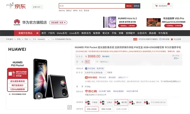 华为P50 Pocket采用突破性的折叠创新技术,实现折叠无缝、纤薄、精致灵巧。华为P50 Pocket最大的亮点便在于其外观设计,竖折方案下的晶钻立体微雕工艺,让手机拿在手中宛如一款充满艺术质感的化妆盒,小巧而玲珑。性能方面,该手机搭载了满血骁龙888处理器,水滴铰链设计加上6.9英寸可折叠柔性屏幕,让多角度悬停下的画面张力溢出屏幕。4000万像素原色摄像头和1300万超广角摄像头组合也延续了华为P系列一贯的优秀影像力,8+256GB版本京东到手价为8988元。